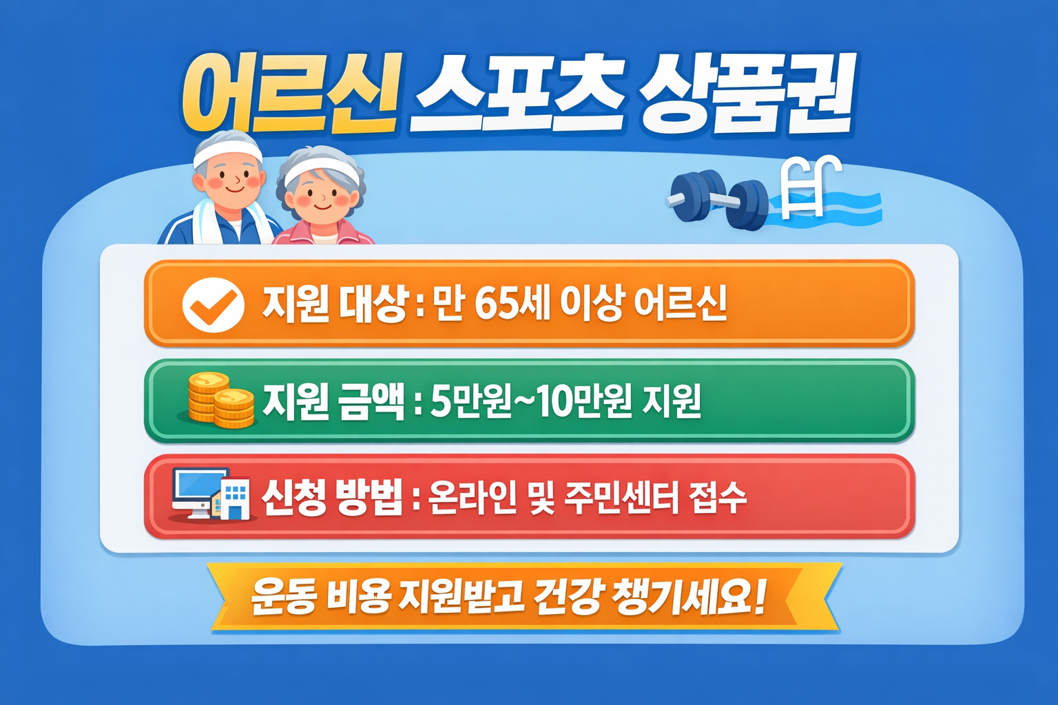 부모님 건강을 챙길 수 있는 방법은 생각보다 가까이에 있습니다. 어르신 스포츠 상품권은 운동비 부담을 줄여드리고, 건강한 생활을 이어가실 수 있도록 돕는 좋은 제도입니다.특히 어르신분들은 직접 알아보시기 어려운 경우가 많기 때문에, 자녀분들이 대신 확인해드리는 것이 가장 빠른 방법입니다.
